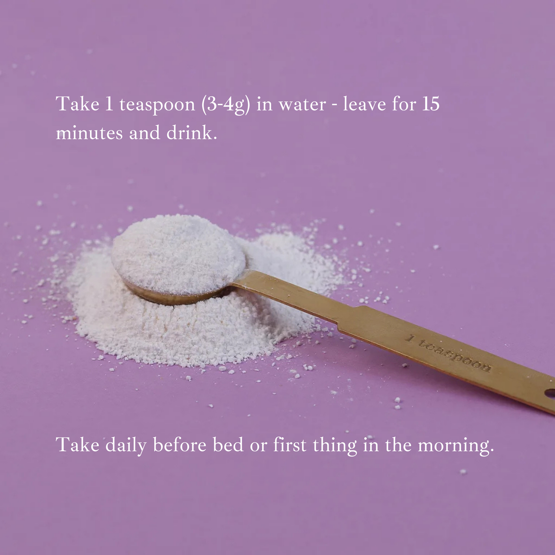 1 teaspoon (3g) mixed in water, stir well, leave for 10-15mins, and stir again before drinking.