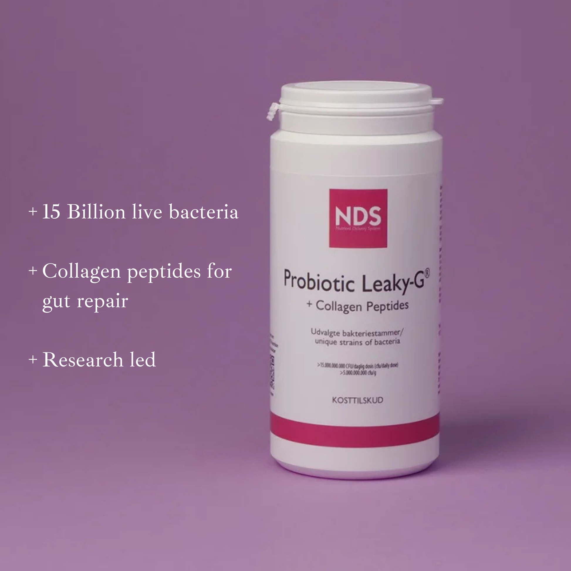 Our gut-flora bacteria and collagen peptides powdered blend is designed to aid with inflammation, allergies, or autoimmune conditions that could be linked to leaky gut, intestinal permeability, and leaky intestine.